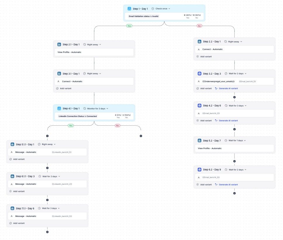 Slimme leadopvolging door persoonlijk LinkedIn contact te combineren met schaalbare e-mailflows. Het systeem volgt leads automatisch op via meerdere kanalen, reageert op interacties en zet direct de juiste vervolgstap in gang. Alle contactmomenten blijven centraal zichtbaar, waardoor geen enkele lead uit beeld raakt en opvolging altijd consistent verloopt.