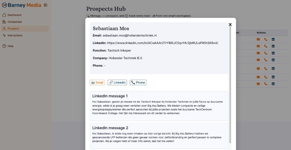 Barney AI heeft een SaaS-oplossing ontwikkeld die AI-analyse van prospects naadloos combineert met persoonlijke outreach. Warme leads worden automatisch verrijkt, beoordeeld en opgevolgd met berichten die aansluiten op hun profiel, updates, gedrag en eerdere interacties.