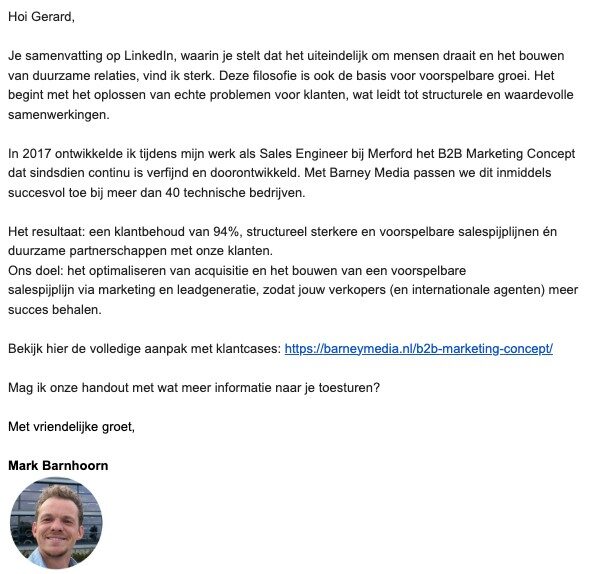 Elke lead ontvangt communicatie die past bij jouw voorkeuren en doelstellingen, volledig op maat geschreven en verzonden via e-mail, LinkedIn of zelfs fysieke post.
